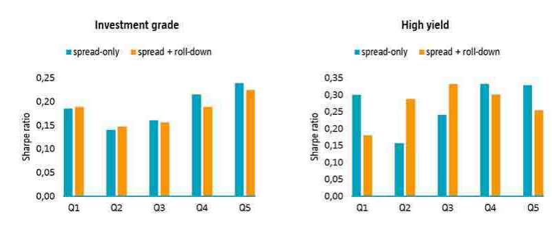 Grafik 1 Grafik 1 zeigt die Sharpe-Ratios von Carry-Portfolios aus den Bereichen Investment-Grade (IG) und High-Yield (HY). Wäre Carry ein eigenständiger Faktor, würden die Sharpe-Ratios vom Portfolio mit dem höchsten Carry zum Portfolio mit dem niedrigsten Carry monoton sinken. Jedoch weist in beiden Bereichen das Portfolio mit dem höchsten Carry gegenüber den übrigen vier Portfolios keine überlegene Sharpe-Ratio auf. Die Sharpe-Ratio von Q1 im Bereich IG beträgt 0,19, im Bereich HY liegt sie bei 0,18. Basierend auf diesen Ergebnissen sollte ein Anleger bei der Bildung eines Credit-Portfolios Carry nicht als eigenständigen Faktor betrachten.