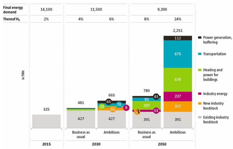 In Europa haben Länder wie Deutschland, Frankreich, Spanien und die Niederlande ehrgeizige Produktionsziele für grünen Wasserstoff formuliert. Außerdem sieht die Europäische Kommission in grünem Wasserstoff ein wichtiges Element, um den europäischen „Green Deal“ und Europas Übergang zu sauberer Energie zu realisieren. In naher Zukunft soll er einige der von Strom aus erneuerbaren Quellen hinterlassenen Lücken bei der Dekarbonisierung schließen. Längerfristig wird mit zunehmender Verfügbarkeit von grünem Wasserstoff voraussichtlich auch dessen Anteil am Energieverbrauch in Europa von gegenwärtig unter 2 % bis zum Jahr 2050 auf einen Wert zwischen 8 % in einem „Business-as-usual“-Szenario und bis zu 24 % in einem ehrgeizigen Szenario steigen.2