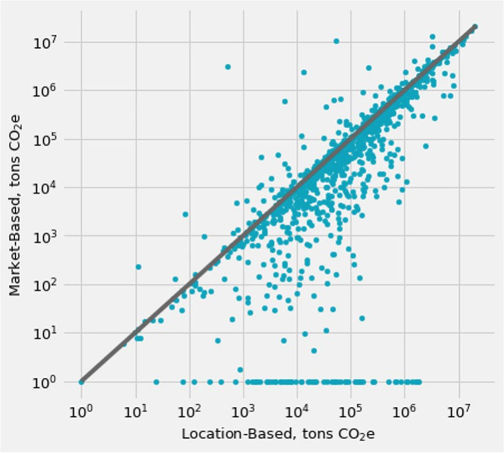Am unteren Ende der Grafik finden sich die Unternehmen, die beträchtliche LB Scope 2-Emissionen, aber keine MB Scope 2-Emissionen aufweisen. Diese Unternehmen haben allgemeine Verträge mit Lieferanten erneuerbarer Energien abgeschlossen oder haben ihre Emissionen vertraglich mit Drittparteien ausgeglichen. Die graue Linie zeigt gleichhohe MB Score 2-Emissionen und LB Scope 2-Emissionen an.