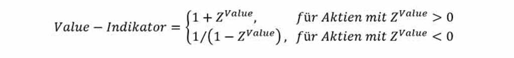 Das value-orientierte Portfolio haben wir durch Neugewichtung des kapitalisierungsgewichtete Portfolios auf Basis des Buchwert/Kurs-Verhältnisses gebildet. Zunächst haben wir einen Value-Z-Score berechnet, indem wir das Buchwert/Kurs-Verhältnis auf die Bandbreite von -3 bis +3 standardisiert haben. Dieser wird zur Ermittlung des Value-Indikators verwendet (siehe unten):
