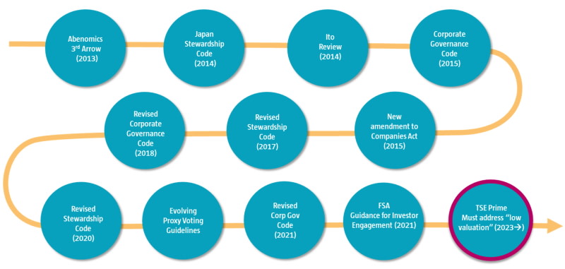 Die TSE stellte fest: „In Japan gibt es viele Fälle, in denen das Management die Kapitalkosten und den Aktienkurs seines Unternehmens nicht kennt. Die TSE könnte die Unternehmensleitung dazu anhalten, die Kapitalkosten und die Kapitaleffizienz des Unternehmens ordnungsgemäß zu ermitteln, diese Größen sowie den Aktienkurs und die Marktkapitalisierung zu evaluieren und erforderlichenfalls Strategien und konkrete Initiativen zur Verbesserung offenzulegen. Insbesondere Unternehmen, deren Kurs/Buchwert-Verhältnis durchweg unter 1,0 liegt, sollten verpflichtet werden, ihre Politik und spezifische Verbesserungsmaßnahmen offenzulegen. Darüber hinaus sollte der 2007 von der TSE eingeführte Verhaltenskodex für Unternehmen überprüft und gegebenenfalls überarbeitet werden, um die Verantwortlichkeiten börsennotierter Unternehmen zu klären. Dazu gehört beispielsweise das Bewusstsein für die Kapitalkosten und die Achtung der Aktionärsrechte bzw. der Schutz der Rechte von Minderheitsaktionären.“3