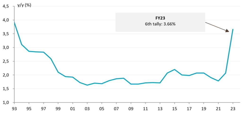 Die Inflation in Japan ist real. Die Inflation in Japan ist eindeutig wesentlich höher als jemals zuvor seit 1991. So hat der Anstieg des Index der Verbraucherpreise Ende 2022 4 % erreicht. Damit ist er viel schneller gestiegen als vorhergesagt, auch von der BoJ selbst. Zuletzt lag der Anstieg des japanischen Verbraucherpreisindex im April 2023 bei 3,4 % im Jahresvergleich. Dies war der 20. Monat mit steigenden Preisen in Folge. Wie aus Abbildung 4 hervorgeht, dürfte sich das Kernlohnwachstum in Japan ab April aufgrund einer kräftigen Steigerung bei den Lohnverhandlungen im Frühjahr beschleunigen. Zum ersten Mal seit Jahrzehnten hält das Lohnwachstum die Inflationsdynamik in Japan aufrecht.