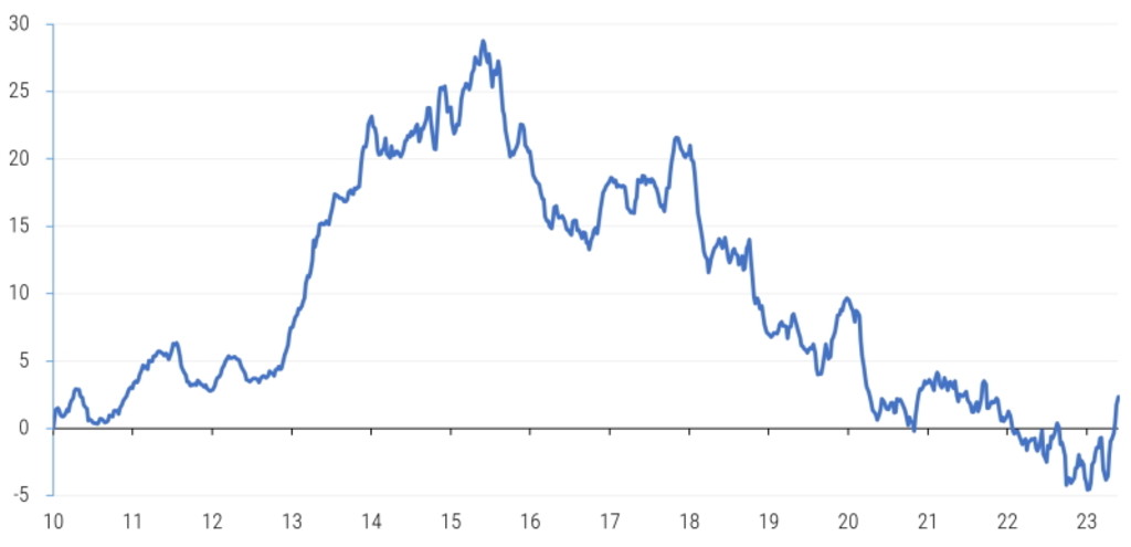 Wir haben uns frühzeitig auf die Abkehr Japans von der Nullzinspolitik und die laufende Reflationierung seiner Volkswirtschaft eingestellt. Dies ist zwar mittlerweile ein wohlbekanntes Szenario. Wir glauben aber nicht, dass sich die internationalen Investoren bereits ganz darauf eingestellt haben, da sie sich noch an mehrere vermeintliche Aufschwünge in den letzten drei Jahrzehnten erinnern. Ausländische Anleger waren bis zum 26. Mai 2023 neun Wochen in Folge Nettokäufer von japanischen Aktien. Dies stellt die längste Serie von Käufen seit 2019 dar. Wie Abbildung 1 zeigt, hat sich der Handel ausländischer Anleger mit japanischen Aktien in letzter Zeit zwar erholt. Er erreicht aber noch nicht das Niveau, das vor zehn Jahren in der ersten Phase der „Abenomics“ zu beobachten war. Die derzeitige Markterholung wird durch das Gewinnwachstum und die von den japanischen Unternehmen vorgenommenen Änderungen im Bereich Governance unterstützt. Diese Entwicklung markiert erst den Anfang. Der überwiegende Teil des verborgenen Werts Japans muss erst noch erschlossen werden.