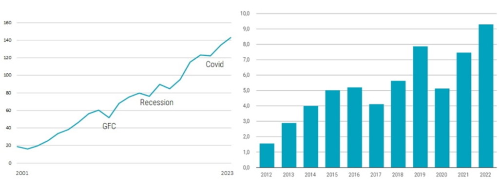 Wir suchen aktiv nach Unternehmen mit historisch bedingten Überkreuzbeteiligungen, überschüssiger Nettoliquidität und aufgeblähtem Immobilienbesitz, der nichts mit dem laufenden Geschäftsbetrieb zu tun hat, um mit ihnen in Dialog zu treten. Diese Unternehmen können wahrscheinlich den Wert brachliegender Assets realisieren und im Laufe der Zeit überschüssige Liquidität an die Aktionäre zurückgeben. Dies ist bereits geschehen, denn sowohl Dividenden als auch Aktienrückkäufe (Abbildung 3) befinden sich in Japan in einem langfristigen Aufwärtstrend.