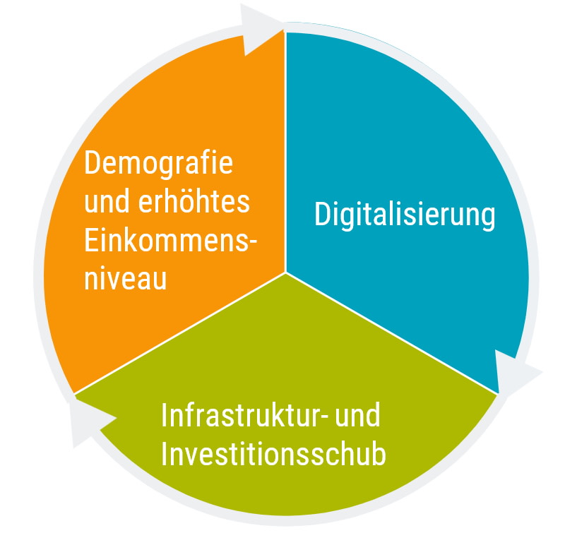 Beiden Faktoren liegen Indiens günstige demografische Voraussetzungen zugrunde. Bis zum Jahr 2030 werden 77 % der über 1,5 Milliarden Inder der Generation der Millennials und der Generation Z angehören und damit Erwachsene im besten Erwerbsalter sein. Verbunden mit steigenden Einkommen kann diese demografische Struktur den Binnenkonsum in Indien deutlich steigern.