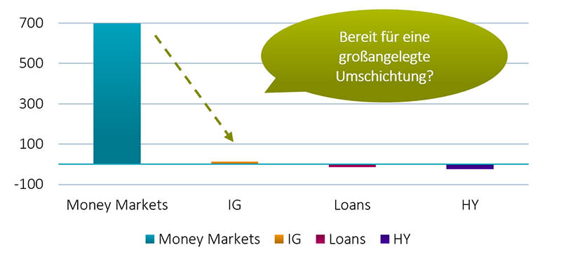 Da die Kapitalflüsse in der Regel der Renditeentwicklung folgen, beginnen die Anleger derzeit, aus Liquidität (Cash) in Unternehmensanleihen (Credits) umzuschichten. Das wirft folgende Frage auf: Ist das eine kluge Entscheidung, oder ist Cash in der aktuellen Situation immer noch zu bevorzugen?