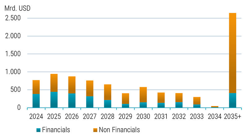 Dies wird auch in der nachstehenden Abbildung 3 deutlich. Sie zeigt die ausstehenden Schulden von US-Firmen mit Investment Grade-Rating (Finanzsektor und übrige Unternehmen). Ein großer Teil der ausstehenden Fälligkeiten läuft bis zum Jahr 2035 oder darüber hinaus. Deshalb muss ein erheblicher Teil der ausstehenden Schulden von Unternehmen mit Investment Grade-Rating erst nach zehn Jahren oder mehr refinanziert werden. Aus diesem Grund werden diese Unternehmen in nächster Zeit nicht mit höheren Zinskosten konfrontiert sein.