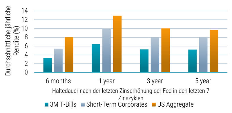 Im Durchschnitt schnitten kurzfristige Unternehmensanleihen über verschiedene Zeiträume (Haltedauer) um 300 Basispunkte besser ab als Geldmarktanlagen. Anleihen mit längerer Duration (US Aggregate) warfen höhere Renditen ab, sind jedoch mit einem höheren Durationsrisiko verbunden. Das bedeutet, dass Anleihen mit längerer Duration bei anhaltender Zinsvolatilität stärker in Mitleidenschaft gezogen werden würden.