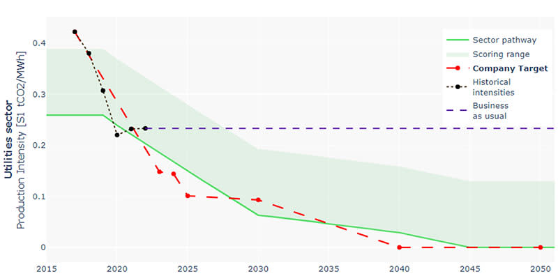 Quelle: Robeco, 2023. Die Grafik ist für einen anschaulichen Stromversorger. Die zugesagten Dekarbonisierungsziele des Unternehmens (der Company Commitment Pathway) sind durch die gestrichelte rote Linie gekennzeichnet. Die durchgezogene grüne Linie ist der sektorale Benchmark-Pfad, der die Emissionssenkungen angibt, die erforderlich sind, um die TPI-Szenarien für Temperaturen unter 2 °C bis 2050 zu erreichen.