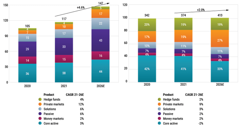 Abbildung 1: Rasches Wachstum des verwalteten Vermögens (in Bio. USD) und der Erträge (in Mrd. USD); erwarteter durchschnittlicher Anstieg p.a. von 2021 bis 2026