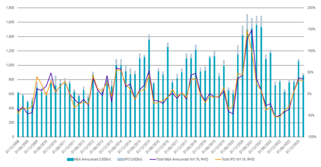Wir registrieren derzeit zwei Entwicklungen, die eindeutig positiv für den Bereich der alternativen Anlagen sind. Das Schwungrad der Kapitalmärkte beginnt sich zu drehen, und die Aktivitäten in den Bereichen M&A und Börsengänge nehmen nach zwei Jahren der Inaktivität wieder zu. Laut EY3 lagen die Fusions- und Übernahmetätigkeiten Ende April um 30 % höher als im selben Zeitraum des Vorjahrs. Dies zeigt sich auch im Transaktions-Volumen von Dealogic, das sich gegenüber den Werten von Anfang 2023 erholt hat.