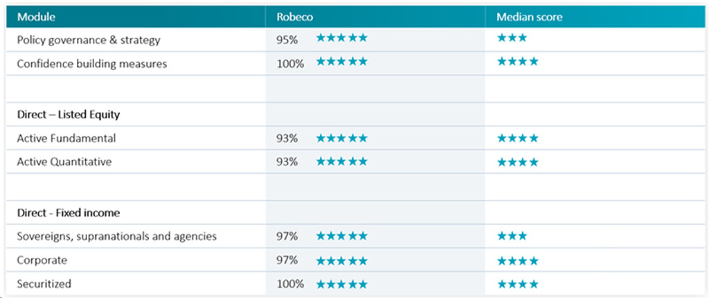 Robeco received 100% scores for the direct fixed income securitized investment strategies and confidence building measures modules in the report. Direct fixed income for corporate and SSA products both received 97%, while the policy for governance and strategy module was awarded 95%. Robeco’s direct listed equity offerings for active fundamental and active quant products both got a score of 93%. All were awarded the maximum five stars for scores above 90%.