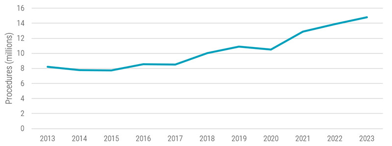 Jedes Jahr steigt die Zahl der Google-Suchen nach „Botox“ in den Wochen vor dem US-Feiertag Thanksgiving deutlich an. Die Menschen wollen offenbar ihr Aussehen auffrischen, bevor sie sich mit Familie und Freunden treffen. Dieser Anstieg an Thanksgiving unterstreicht die zunehmende Nachfrage nach Schönheitsprodukten, die sofortige und spürbare Ergebnisse versprechen. Im Jahr 2023 wurden etwa 15 Millionen ästhetische Injektionsbehandlungen durchgeführt, davon 9 Millionen mit Botox und 6 Millionen mit sogenannten „Fillern“ (siehe Abbildung 6). Der Hauptzweck von Botox sind weniger Falten, während Filler meist zur Wiederherstellung des Gesichtsvolumens und der Gesichtskonturen Anwendung finden.