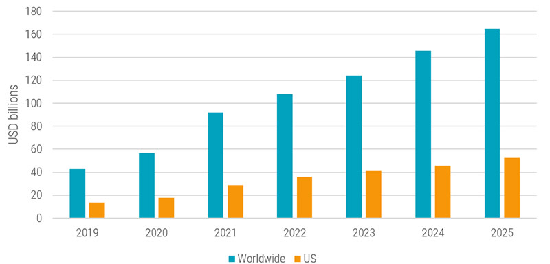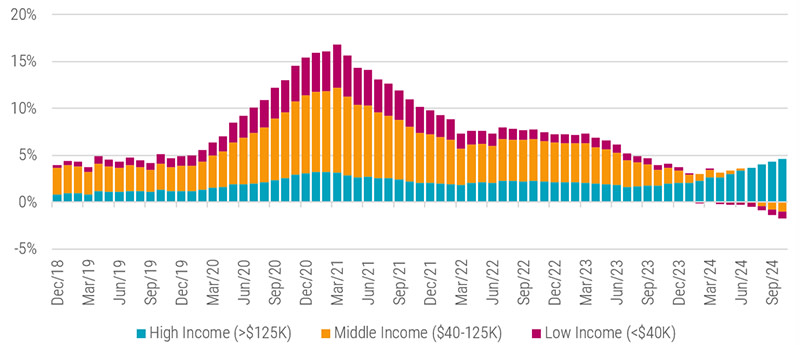 In Bezug auf Konsumausgaben und die Aussichten für unsere langfristigen Themen bleiben wir für 2025 optimistisch. Die US-Konsumausgaben waren 2024 sehr beständig, wie aus Abbildung 1 hervorgeht, obwohl die Ausgaben in erster Linie von Verbrauchern mit hohem Einkommen getätigt wurden. Diese wohlhabende Kohorte wurde durch steigende Vermögenswerte unterstützt, während die Verbraucher mit niedrigem/mittlerem Einkommen trotz eines gesunden Lohnwachstums 2024 einen Rückgang verzeichneten, da sie unverhältnismäßig stark von der Inflation betroffen waren. Diese Trends dürften sich 2025 fortsetzen, auch wenn eine moderatere Inflation Verbrauchern im unteren Preissegment mehr Spielraum für ihre Ausgaben geben dürfte. Während die jüngsten stagnierenden Inflationszahlen den Anleihenmarkt enttäuscht haben, bleibt der wichtigste Indikator unserer Ansicht nach der US-Arbeitsmarkt. Da die Arbeitslosenquote in den USA weiterhin in etwa bei den historisch niedrigen 4 % liegt, wird unserer Einschätzung nach die Sicherheit des Arbeitsplatzes für ein lebhaftes Ausgabenniveau sorgen.