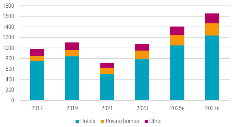 Die Konsumausgaben für Unterkünfte haben dazu beigetragen, dass der Gesamtumsatz der Branche im Vergleich zu 2019 um 12 % gesteigert wurde. Da Verbraucher zunehmend auf der Suche nach einzigartigen Erlebnissen sind, haben Dienste wie Airbnb und VBRO den Markt deutlich verändert, indem sie das Zweitwohnungsinventar online zur Vermietung anbieten. Die Ausgaben für diese alternativen Unterkünfte haben sich laut McKinsey seit 2019 um 49 % erhöht. Dennoch entfallen noch immer 74 % der Ausgaben für Reiseunterkünfte auf Hotels. Laut Amadeus, einem Anbieter von Reisetechnologie, werden sich die Buchungen in Boutique-Hotels bis 2032 fast verdoppeln, da die Nachfrage nach Alleinstellungsmerkmalen steigt.