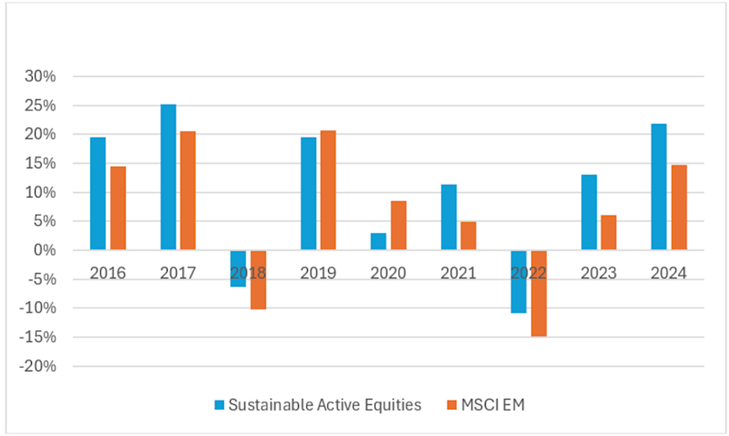Die bisherige Performance bietet keine Garantie im Hinblick auf zukünftige Ergebnisse. Der Wert von Kapitalanlagen kann schwanken. Quelle: Robeco. Beispielhafte Strategie. Die Angaben basieren auf den Live-Portfolios der Strategie in EUR und sind vor Abzug von Gebühren. Auflegungsdatum: Februar 2015. Performance gemessen am MSCI EM Index. Die Währung, in der die bisherige Performance angegeben ist, kann von der Währung des Landes abweichen, in dem Sie Ihren Wohnsitz haben. Aufgrund von Wechselkursschwankungen können die Renditen in Ihrer Landeswährung höher oder niedriger ausfallen. In der Realität werden Kosten (wie Verwaltungsgebühren und andere) Kosten berechnet. Diese wirken sich nachteilig auf die angegebenen Renditen aus. Stand der Daten: April 2025.