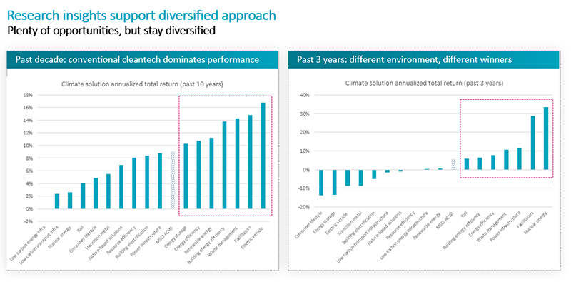 Lösungsanbieter stehen bei der Abschwächung des Klimawandels bereits an der Spitze, wie z. B. Anbieter von Windenergie und Hersteller von Elektrofahrzeugen. Ihre Performance war in den vergangenen zehn Jahren stark, obwohl die Renditen in den letzten drei Jahren und seit Jahresbeginn eingebrochen sind, da die Geschäftsmodelle bei vielen von ihnen aufgrund von Änderungen der Zinssätze, dem Wegfall von Subventionen oder anderen makroökonomischen Faktoren unter Druck geraten sind.