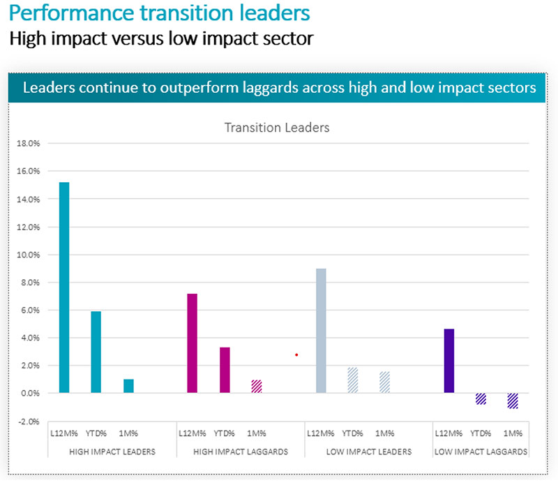 Vorreiter des Übergangs führen die Dekarbonisierungsbemühungen an, um Netto-Null-Emissionen zu erreichen. Der Hauptunterschied besteht darin, dass Vorreiter des Übergangs zwar derzeit hohe Emissionen verursachen und auf Netto-Null-Emissionen hinarbeiten können, aber noch nicht am Ziel sind. Manche Anleger sind der Meinung, dass „unfertige“ Unternehmen daher größere Chancen bieten als Lösungsanbieter, aber es gibt widersprüchliche Wahrnehmungen darüber, wer das bessere Potenzial aufweist.