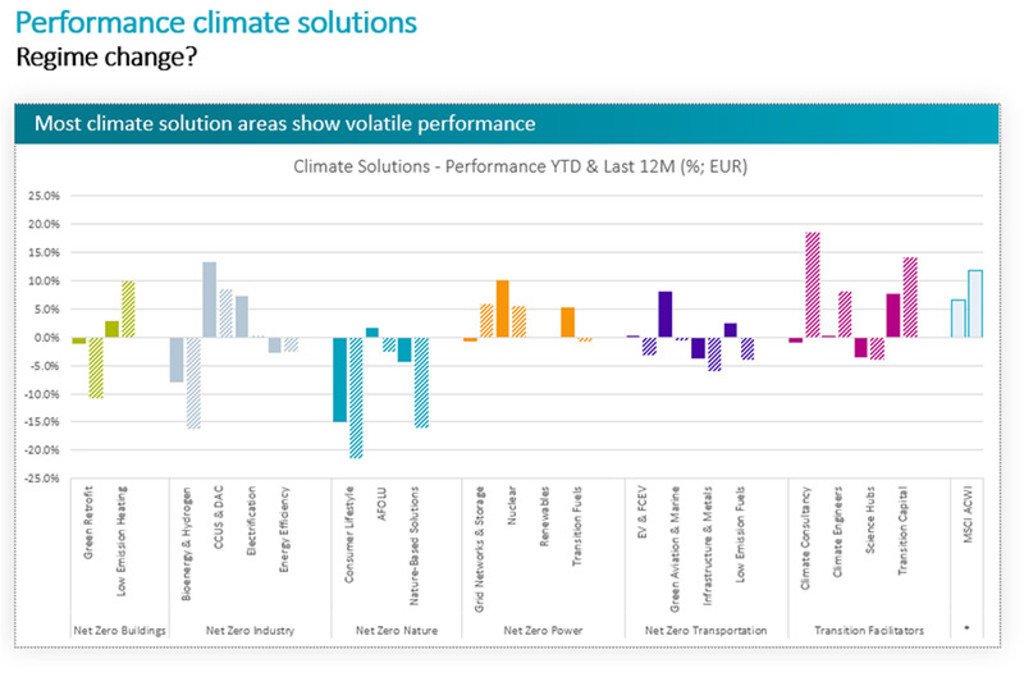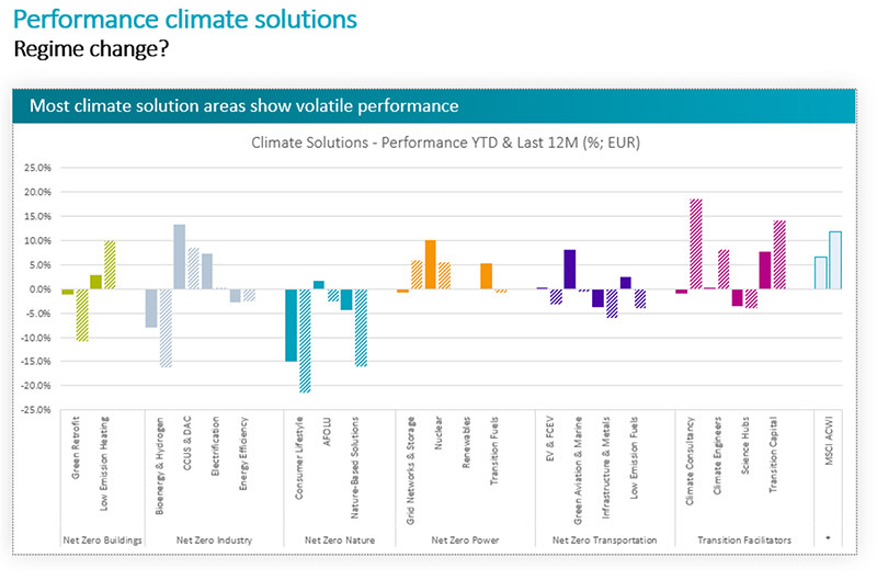 Dieser Druck hat dazu geführt, dass Unternehmen, die in Sektoren wie Netto-Null-Gebäude, Bioenergie und Wasserstoff sowie Lebensstile der Verbraucher tätig sind, eine unterdurchschnittliche Performance verzeichnen, während Sektoren wie Netto-Null-Energie und Klimaberatung starke Renditen erzielt haben. Dies wird in der untenstehenden Grafik veranschaulicht.