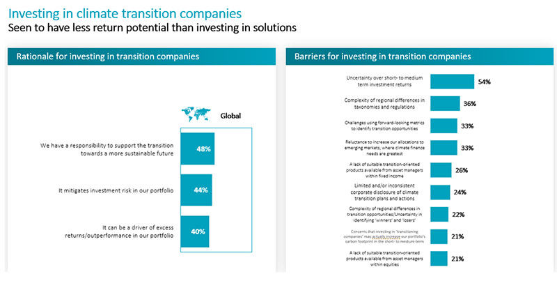 In der Climate Survey bevorzugten Anleger eindeutig die potenziellen Renditen, die sich aus Lösungen von im Übergang befindlichen Unternehmen ergeben. Etwa 77 % der globalen Anleger sahen ein hohes Renditepotenzial für Klimalösungen, während 40 % der Meinung waren, dass im Übergang befindliche Unternehmen Überschussrenditen oder „Alpha“ erwirtschaften können. Etwa 63 % wollten durch ein quantifizierbares Ziel oder eine allgemeine Verpflichtung in Lösungen investieren.