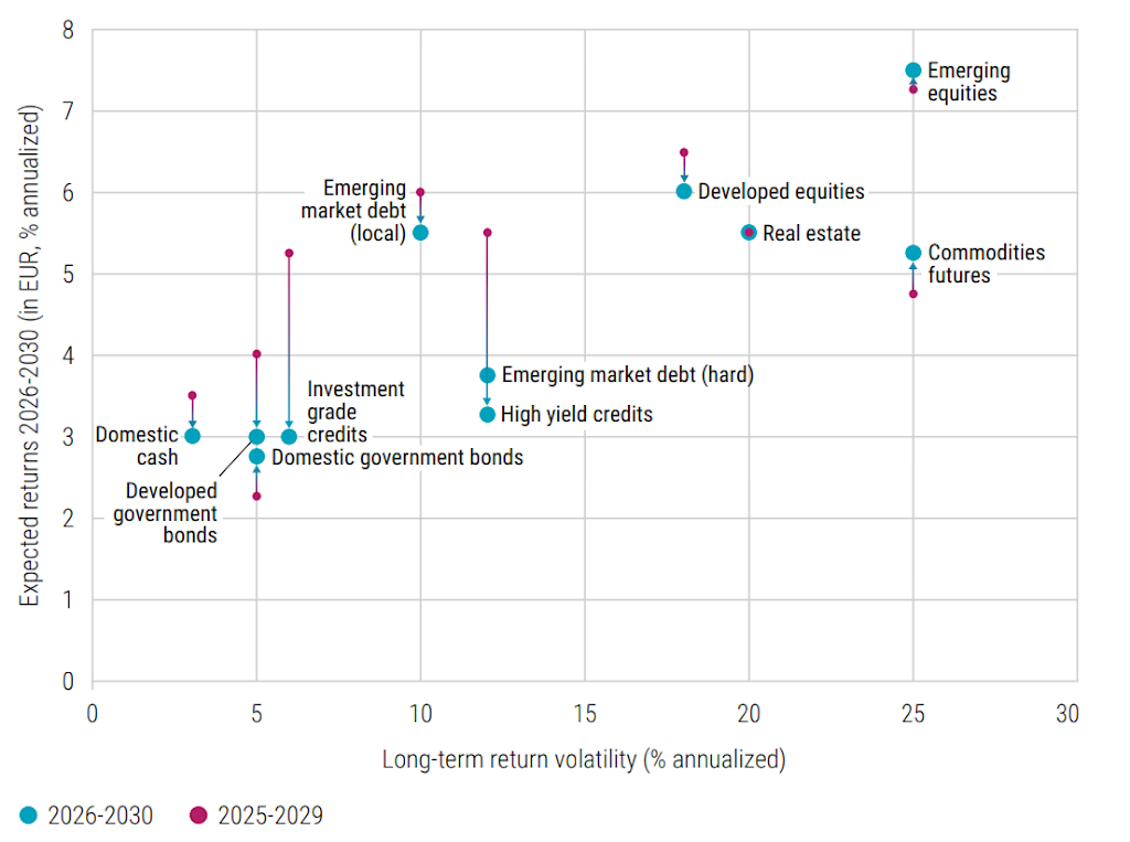 Quelle: Robeco. September 2025. Die vertikale Achse zeigt die erwarteten geometrischen annualisierten Renditen für einen Euro-Anleger über die Zeiträume 2026-2030 und 2025-2029. Die horizontale Achse ist ein Näherungswert für die langfristige Volatilität der einzelnen Anlageklassen.