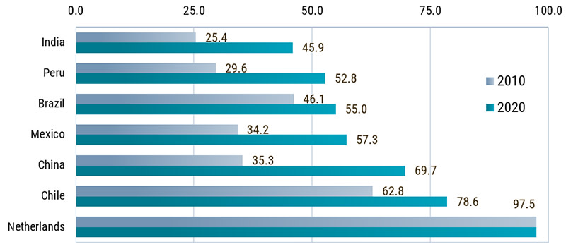 Abbildung 1 – Beschleunigtes Wachstum der Sanitärversorgung in Schwellenländern (%)