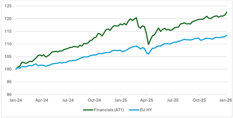 Quelle: Bloomberg, Gesamterträge des Bloomberg Europe CoCo Tier 1 Index im Vergleich zum Bloomberg Euro High Yield Index, Januar 2026.
