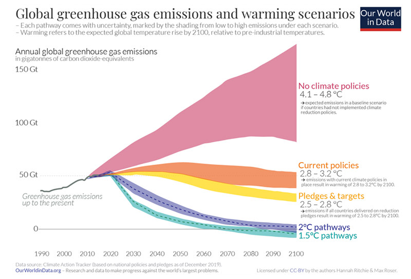 Zur Erreichung dieser Ziele sind klare Vorgaben zur Verringerung von CO2-Emissionen erforderlich. Im Jahr 2018 gab das IPCC an, dass zur Erreichung des Ziels von 1,5 °C die Emissionen bis 2030 um 40-60 % gegenüber dem Stand von 2010 reduziert und bis etwa 2050 auf netto null gesenkt werden müssen. Um die Obergrenze von 2 °C einzuhalten, müssten die Emissionen bis 2030 um 25 % verringert werden, damit das Netto-Null-Ziel bis 2050 erreicht werden kann.