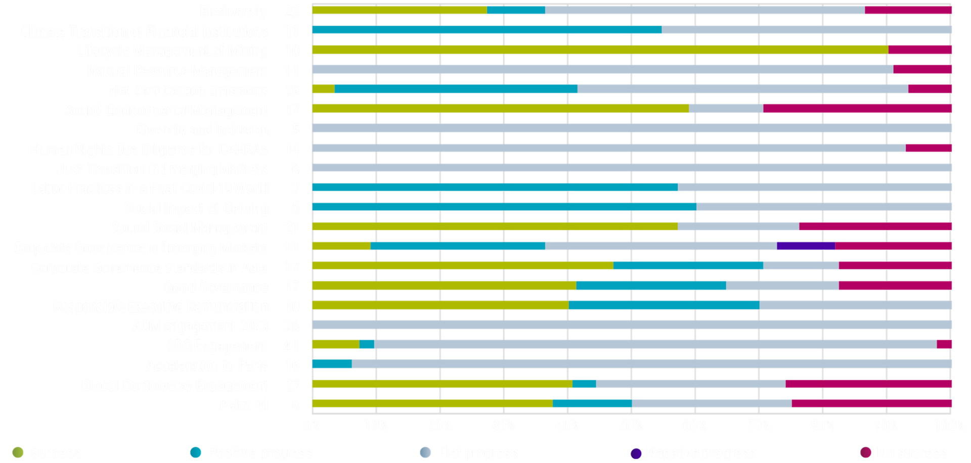 *Die oben aufgeführten Zahlen zum verwalteten Vermögen basieren auf den Aktien- und Anleihenportfolios von Robeco, bei denen wir Engagements und Stimmabgabe einsetzen. Robeco stimmt auch ab und nimmt Einfluss für Kunden, deren Portfolios von anderen Assetmanagern verwaltet werden. Wir nennen diese „Overlay-Kunden“. Im Laufe des Jahres 2024 konnten wir einen neuen Kunden begrüßen, während zwei andere Kunden unsere Dienste nicht mehr benötigten. Insgesamt haben wir 10 Overlay-Kunden, die zum 31. Dezember 2024 ein Vermögen von rund 650 Mrd. EUR repräsentieren.