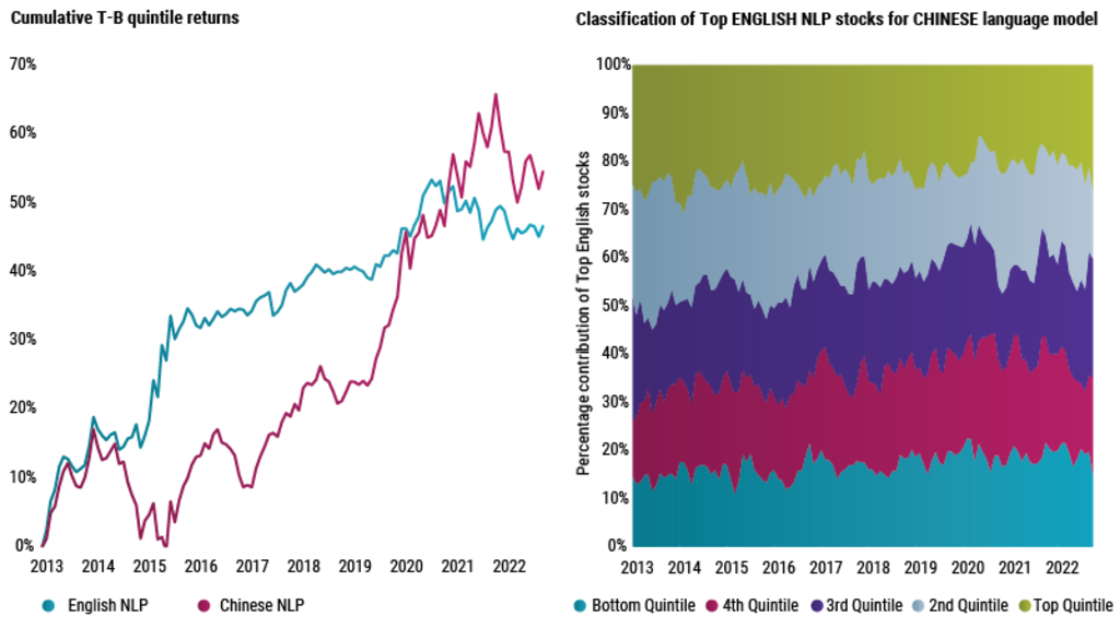 Take, for example, Chinese investment texts. The left-hand chart in Figure 1 shows the performance of factors built from Chinese and English-based NLP engines. The good news is that both are positive, so not all information is lost in translation. However, the right-hand chart in Figure 1 shows that of the top quintile-ranked stocks from the Chinese NLP model, only 50% of which would be classified in the top two quintiles under the English NLP model.
