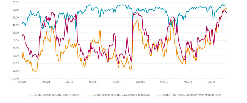 Source: Bloomberg, Robeco, 28 April 2023. Rolling 12-month correlation.