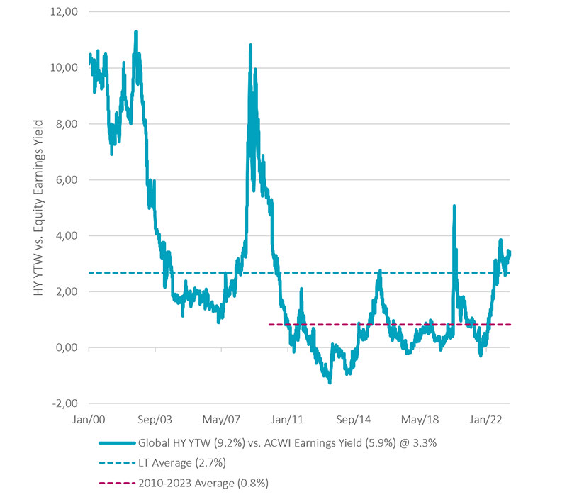 “The reality is high yield still offers a more attractive valuation proposition relative to equities, so if you are sanguine over the recession risks the opportunity is intact,” says Rouffiac, portfolio manager with Robeco Sustainable Multi-Asset Solutions. She points to the historic high differential of the global high yield index versus the global equity earnings yield, which is at 3.3% – higher than the long-term average of 2.7% and way above the 2010-2023 average of 0.8%.