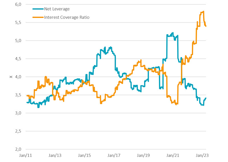 This would not bode well for high yield credit, and current spreads of 550 bps (for global high yield) are not recession-proof. Nevertheless, for now, leverage remains low and interest coverage high in the US high yield space. This in turn suggests healthy credit fundamentals are still supportive of a lower default rate environment.