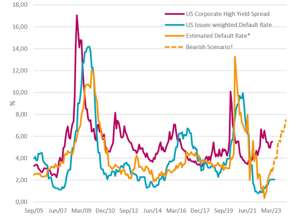 * The estimated default rate is based on the regression of US 12m default rate with Tightening Standards of C&I Loans for Large and Medium firms (1Y lag) and 1Y Change in unemployment rate (1Q lag)
