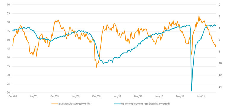 “Looking for cues in the latest macro data, one cannot overlook the conundrum that is the level of US unemployment compared to cyclical indicators,” says Rouffiac. Historically, the US ISM Manufacturing index below 50, pointing to a contraction, would typically coincide with an unemployment rate of at least 6%, and a rising risk of recession. However, we are yet to see an unemployment rate higher than 3.7%, even though the ISM has been sub-50 since November 2022.