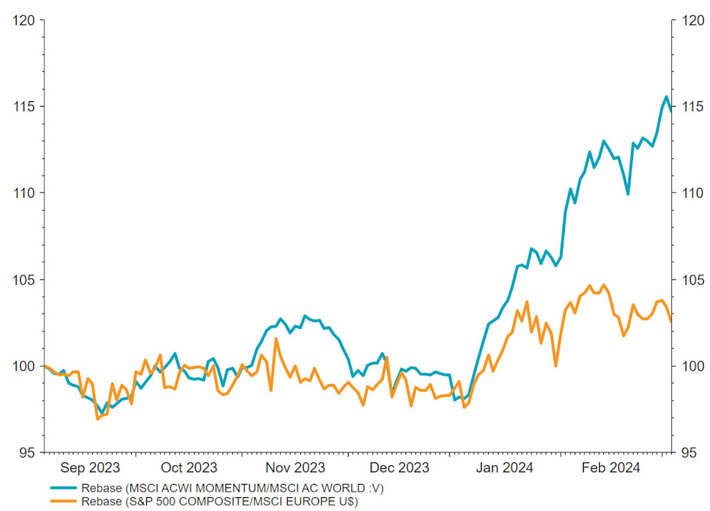 “The nature of this equity market rally is therefore not conducive to seeing structural outperformance of Europe versus the rest of world, or specifically in the US, as European companies are more value-tilted, whereas US stocks have a higher correlation with the momentum factor.”