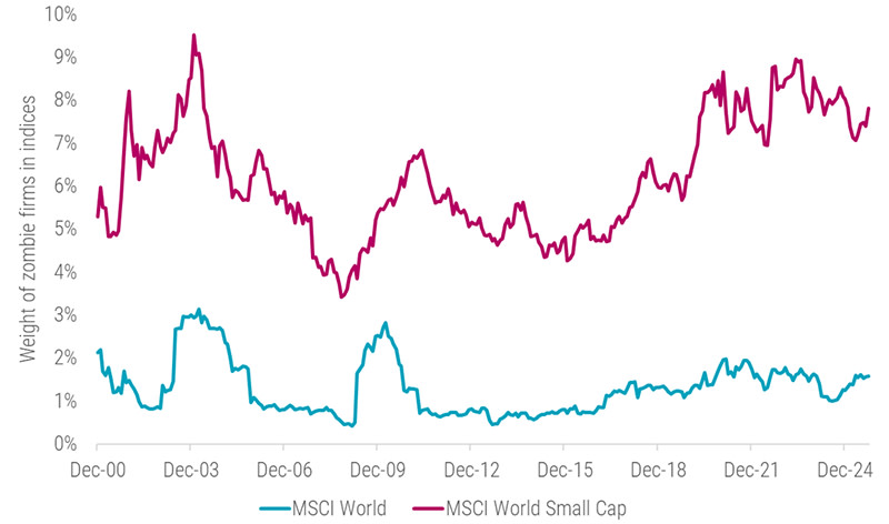 Source: Robeco, LSEG. The chart shows the weight of zombie firms (interest coverage ratio below one for three consecutive years) in the MSCI World and MSCI World Small Cap indices from December 2000 to September 2025.