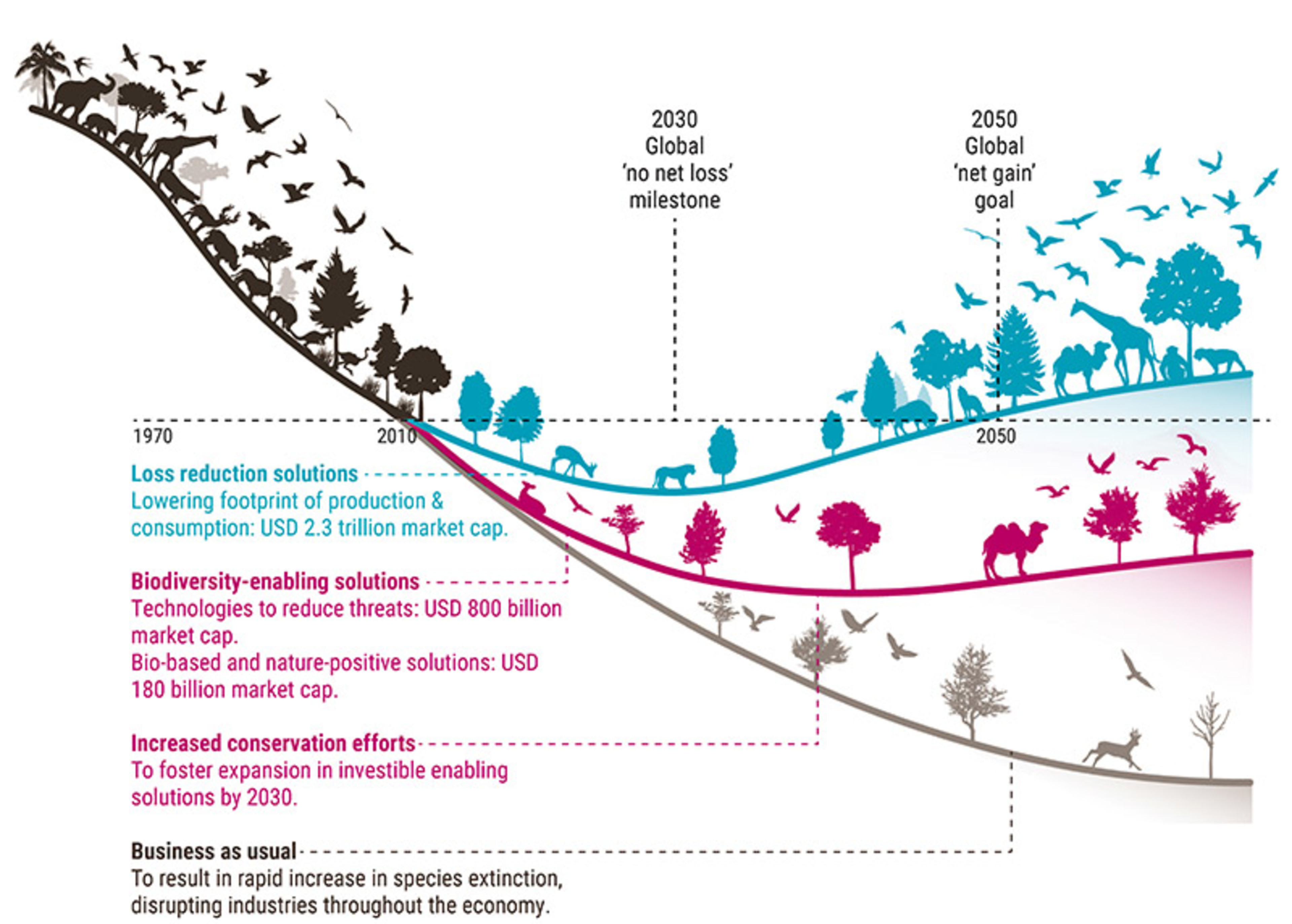 For global investors, bending the curve is not only a major challenge, but also offers two major opportunities. As shown in Figure 2, the first is in the biodiversity transition; changing production and consumption methods affects an industry with a market capitalization of USD 2.3 trillion.