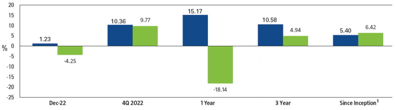 1 Performance figures correspond to the Boston Partners Long/Short UCITS strategy, share class E USD. Performance for other share classes may vary. Performance over one year is annualized. The value of your investments may fluctuate. Past results are no guarantee of future performance. In reality, management fees and other costs are also charged. These have a negative effect on the returns shown. All data to 31 December 2022.