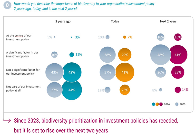 The number of investors for whom biodiversity is a significant or central part of investment policy dropped from 48% in 2023 to 36%, while those who said it formed no part of their policy at all rose from 15% last year to 23%, the Climate Survey showed.