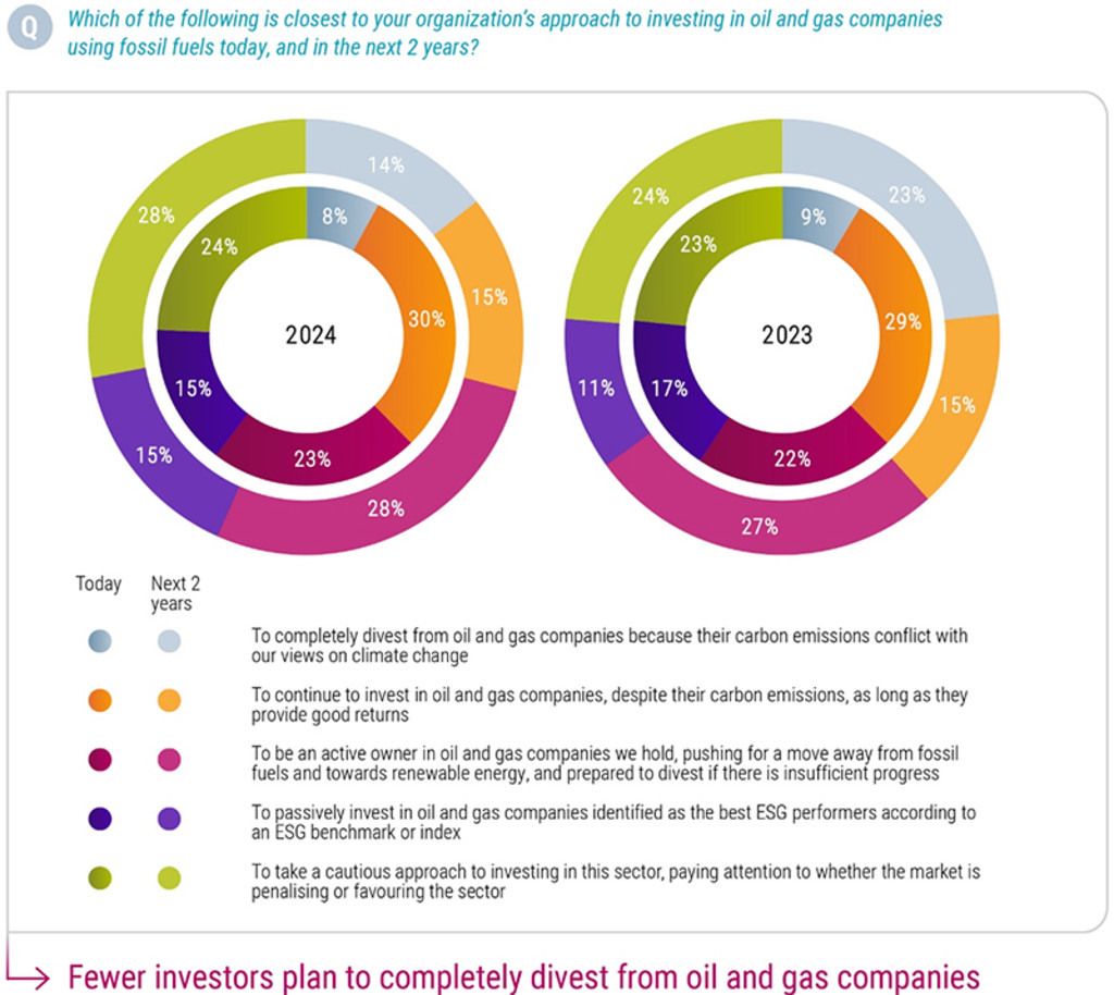 The second headwind is often described as the ‘elephant in the room’ for climate investing – whether to hold fossil fuel companies in portfolios. The number of investors pledging to completely divest from oil and gas companies in the short term dropped from 23% to 14% last year. Some 15% said they would continue to invest as long as they continued to generate returns.