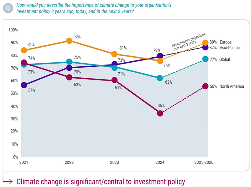 In North America, the number of respondents who said climate change was a significant or central part of their policy slumped from 61% in 2023 to just 35% this year. This was cited as being mainly due to a backlash against sustainable investing generally – in the belief that it hurts returns – that has grown in intensity in the past two years.