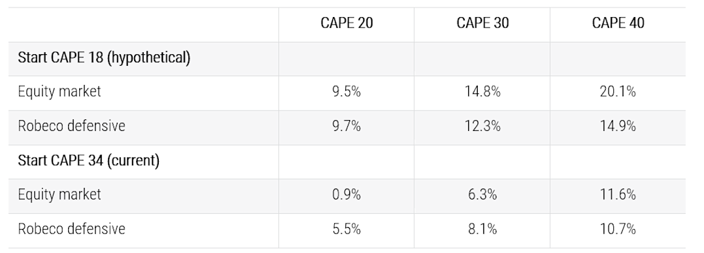 CAPE ratio at 40: If the CAPE ratio increases further, reaching ‘exuberance’ again, equity returns would exceed 10%, similar to the past 15 years. Defensive equities would also perform well, slightly lagging the market.