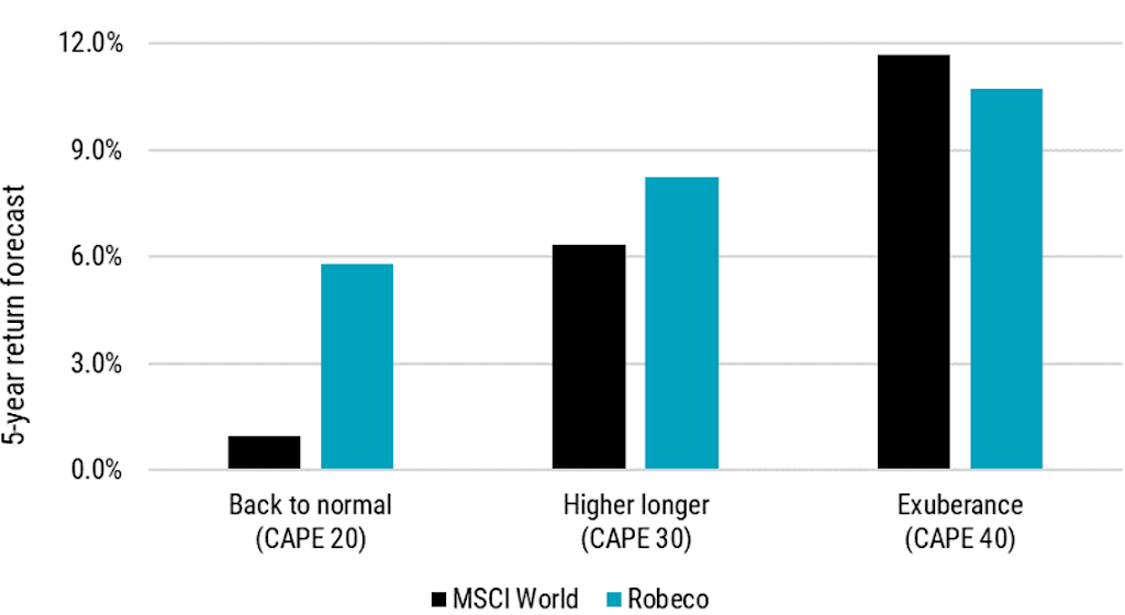 CAPE ratio at 30: In a 'higher for longer' scenario, equity returns would be a moderate 6% since multiple expansion would not be a tailwind. Defensive equities would perform better, with an 8% return.