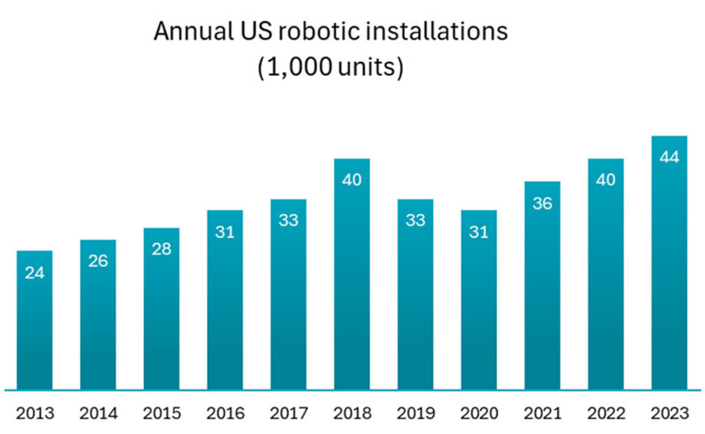 In the US, industrial robotic installations are growing. Source: U.S. Companies Invest Heavily in Robots - IFR Preliminary Results - International Federation of Robotics. April 2024.