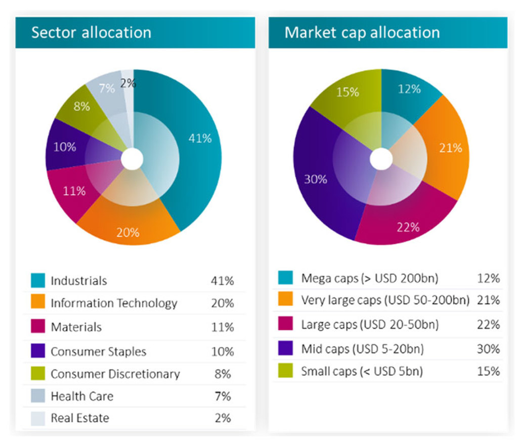 Circular solutions are well positioned to benefit from tailwinds created by the reshoring renaissance. The strategy has a mid-cap tilt, which benefit disproportionately from robust local demand and strong domestic growth relative to international conglomerates.