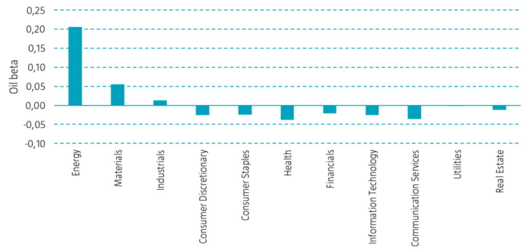 Robeco Quantitative Research, Refinitiv Datastream. The chart uses monthly USD returns for the MSCI World Index and the 11 GICS level 1 sectors, as well as monthly oil price data for the period January 1995 to December 2021.