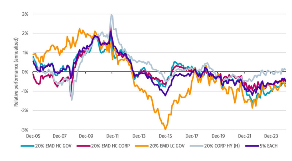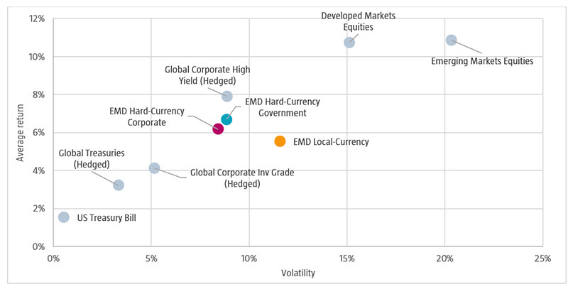 - Both hard-currency and local-currency EMD can be attractive additions to multi-asset portfolios