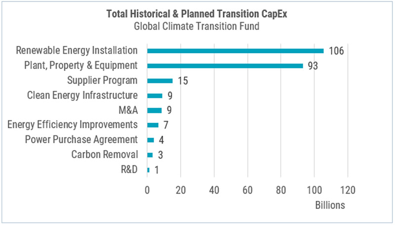 So far within the portfolio, 48 companies have announced 176 identifiable transition capex commitments worth more than USD 81 billion. Around 93% of this capital is targeted toward climate change mitigation. The financial sector was excluded from analysis because its role in financing the transition is an indirect form of capex that requires separate evaluation.