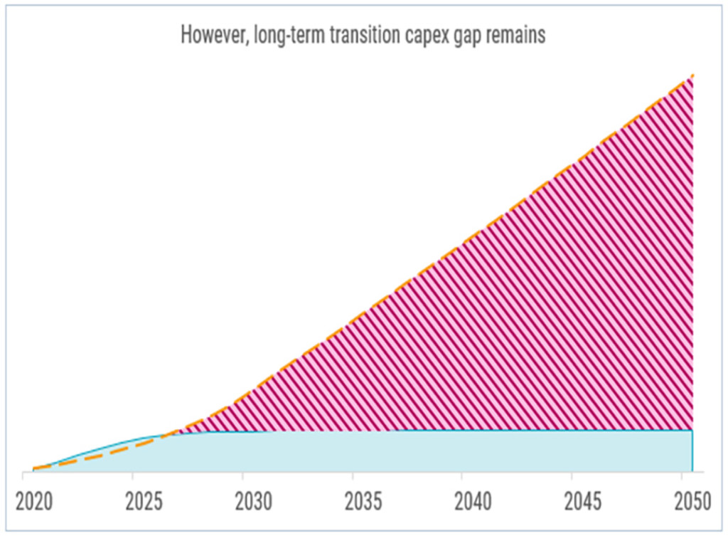 “To remain on track toward 2050 targets, an estimated 12% year-on-year increase in transition capex will be required.” The funding gap can be seen in the chart below.